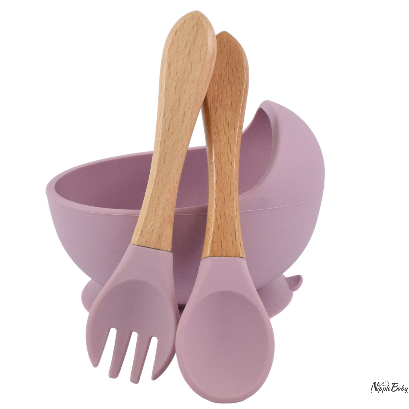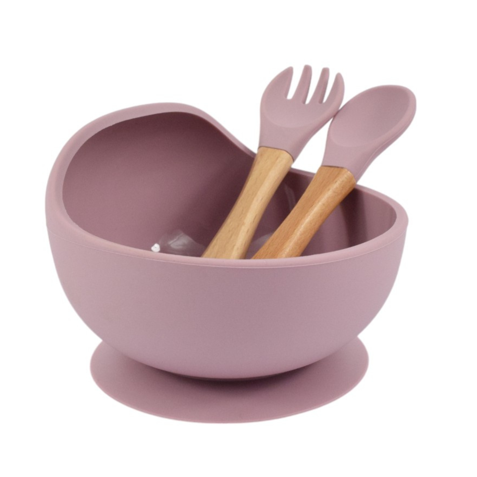 Bol din silicon cu ventuza si tacamuri cu maner din bambus, roz pal