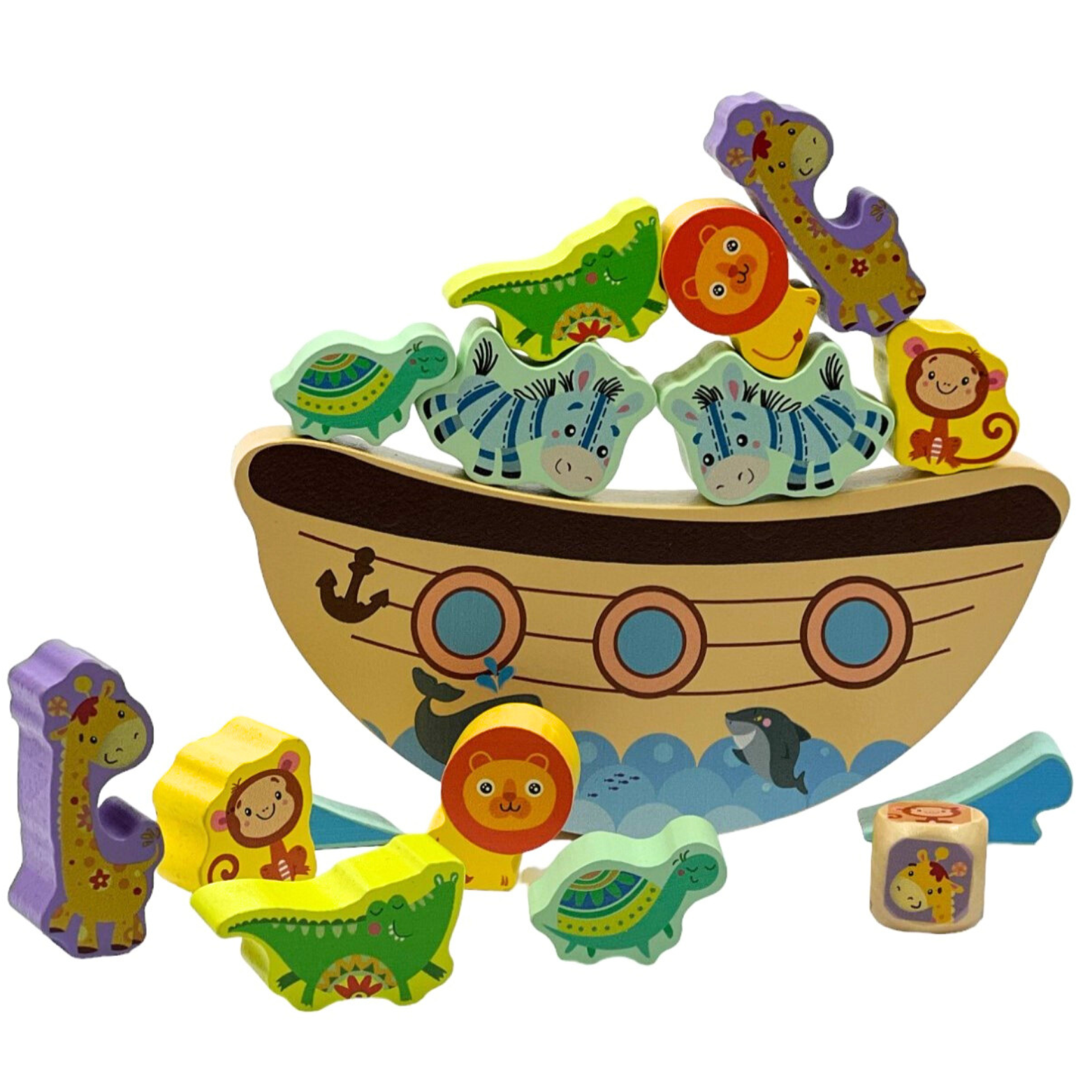 Jucarie Educativa Interactiva din Lemn - Barca cu 12 Animale, Joc de Echilibru cu Zar, 16 Piese.